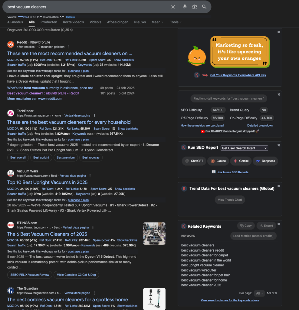 Keywords Everywhere is a lightweight browser extension that shows search volume, CPC, and competition right inside Google. No dashboard overload. No 20-tab research sessions. Just clean data exactly where you’re already searching.
